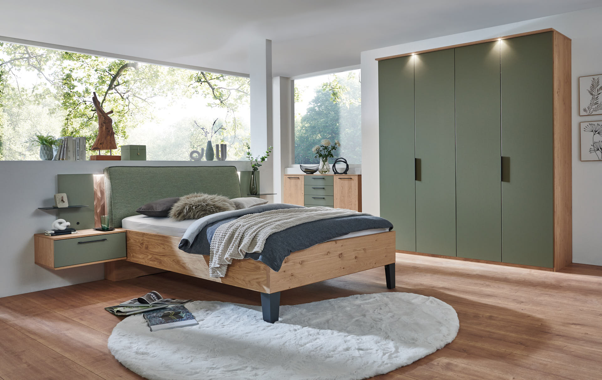 Beim Bett haben Sie die Wahl zwischen unserem nachhaltigen Polsterkopfteile (Bezug zu 100% aus recycleten PET-Flaschen) oder einem platzsparenden Holzkopfteil.