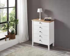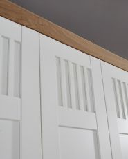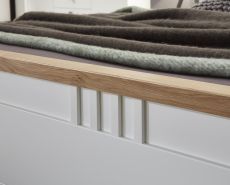 - Landhaus, Urlaub und mehr Meer gehen einem bei diesem Modell durch den Kopf. Weiße Echtlacktüren mit feinen Rahmen und massive Abdeckplatten aus harmonisch warmer Wildeiche auf den Kommoden runden dieses Wohlfühlschlafzimmer ab.