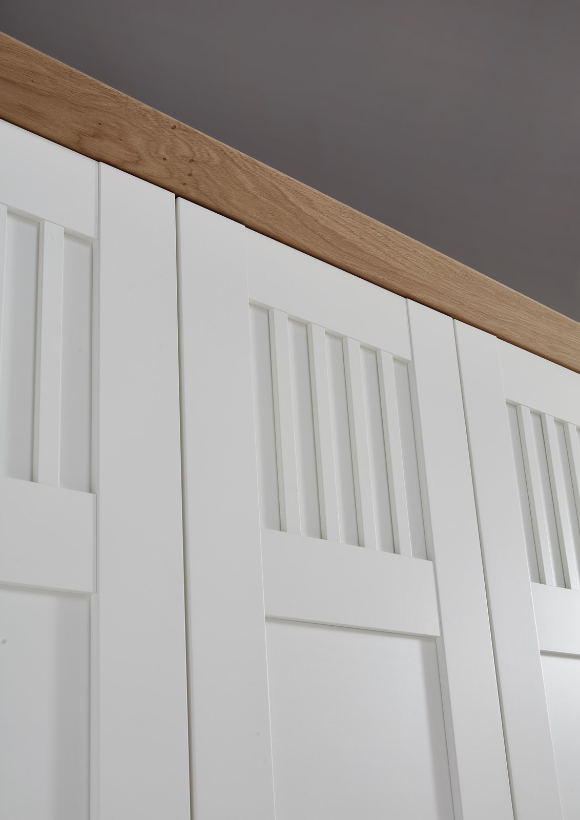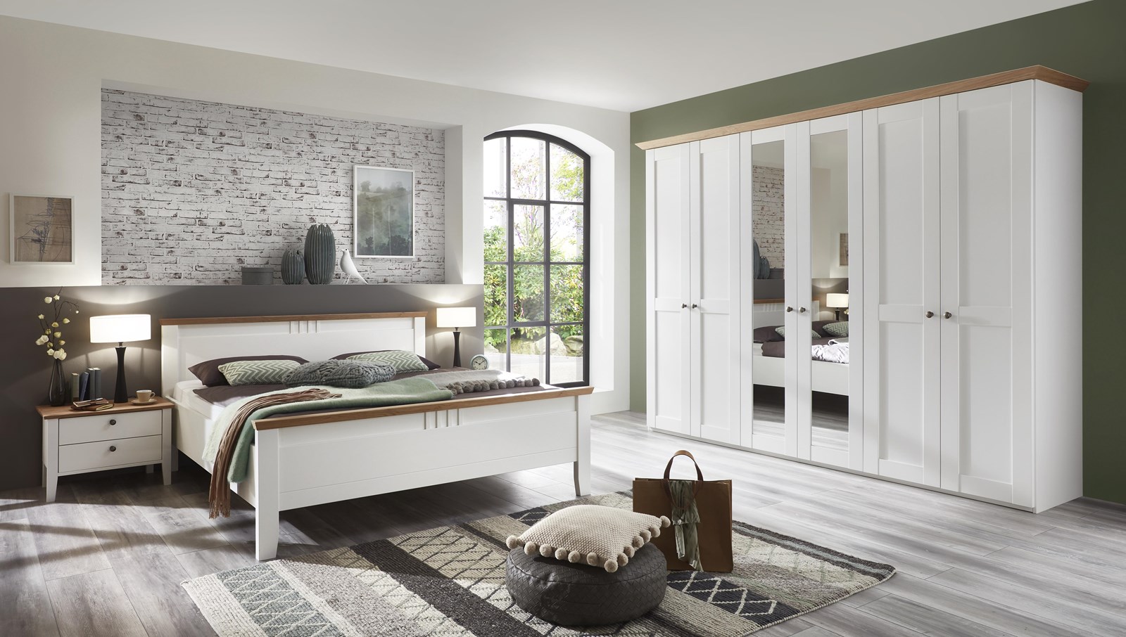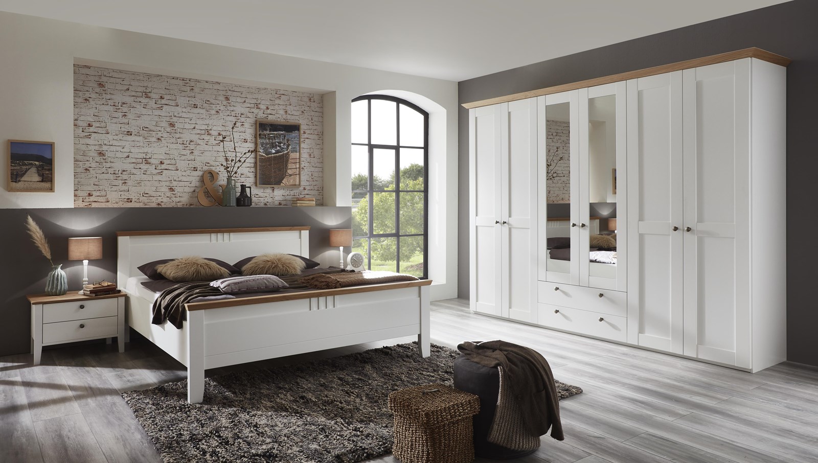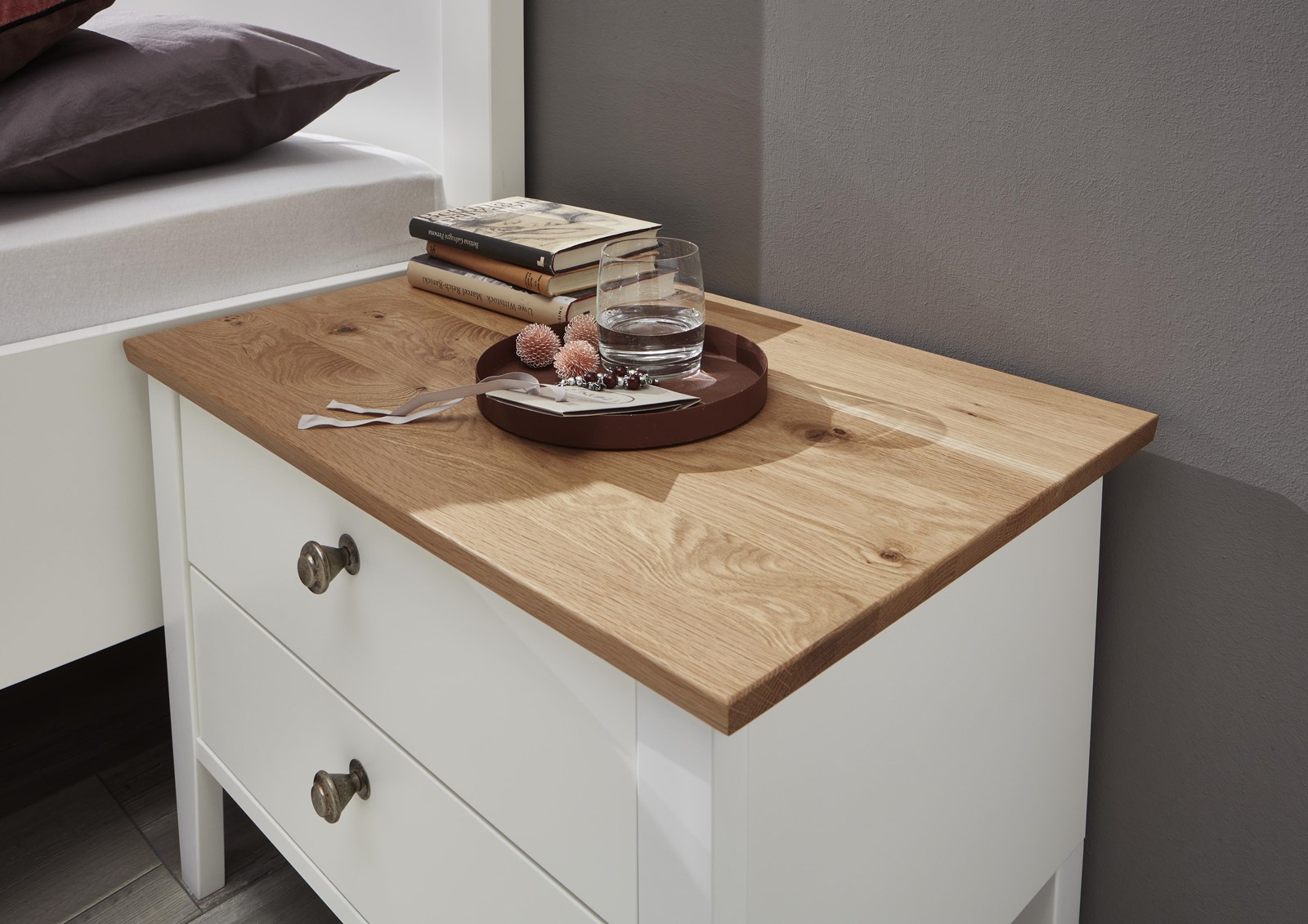 - Landhaus, Urlaub und mehr Meer gehen einem bei diesem Modell durch den Kopf. Weiße Echtlacktüren mit feinen Rahmen und massive Abdeckplatten aus harmonisch warmer Wildeiche auf den Kommoden runden dieses Wohlfühlschlafzimmer ab.