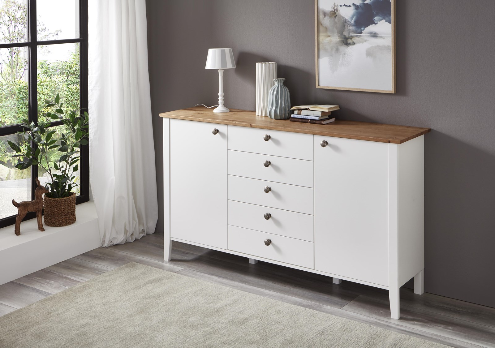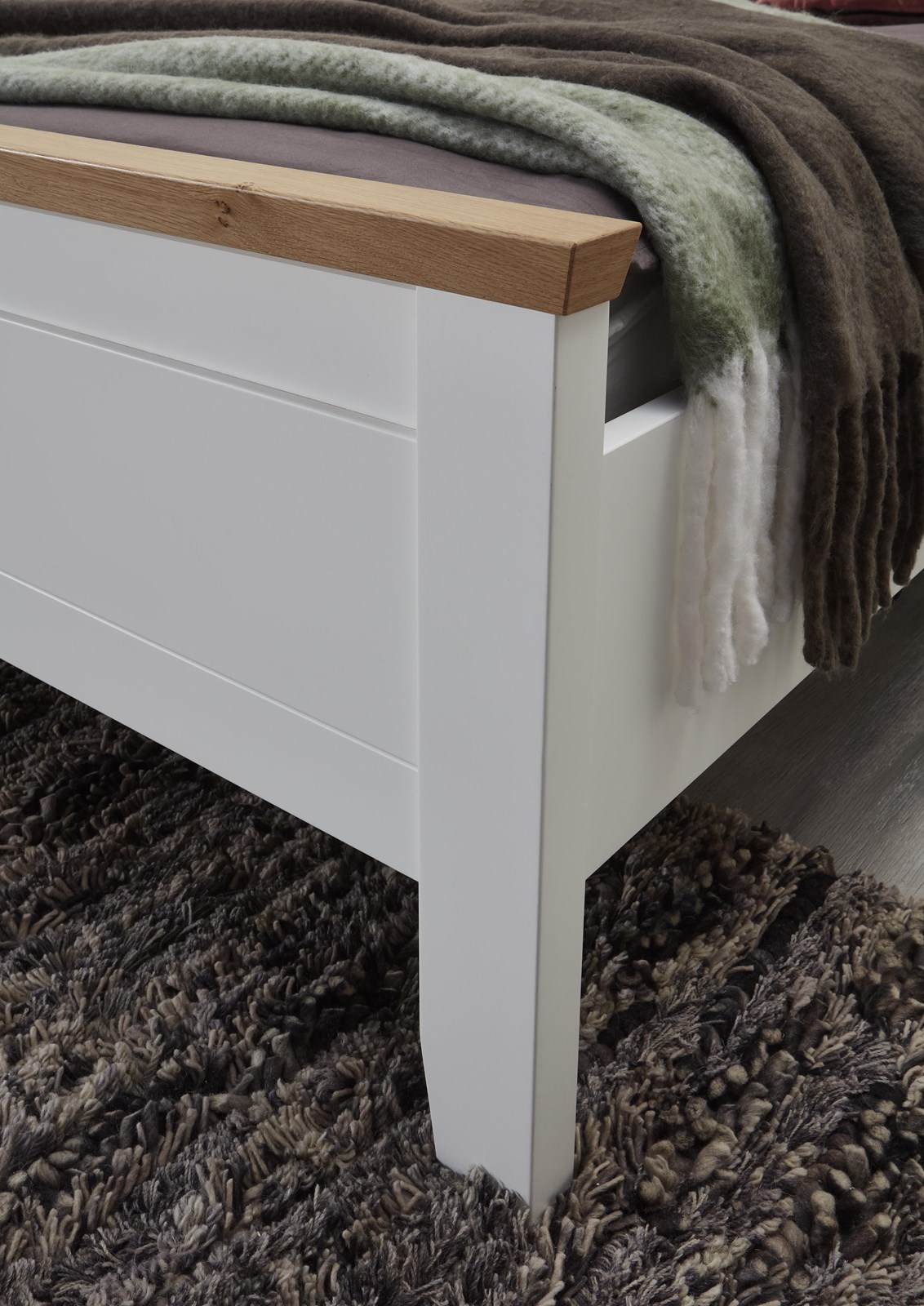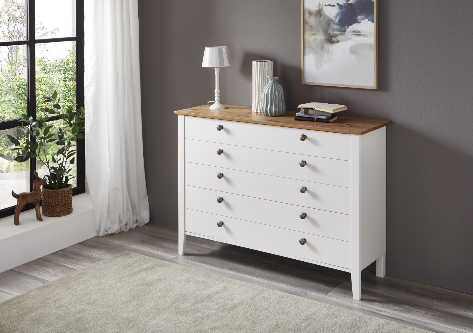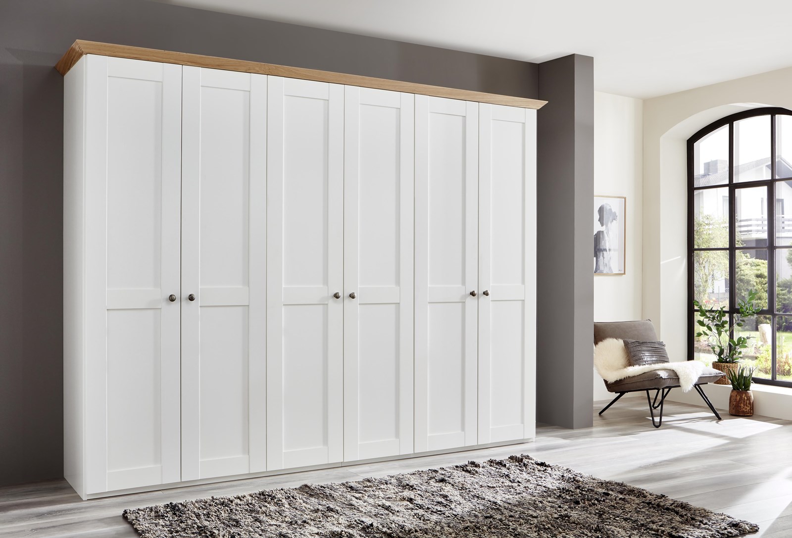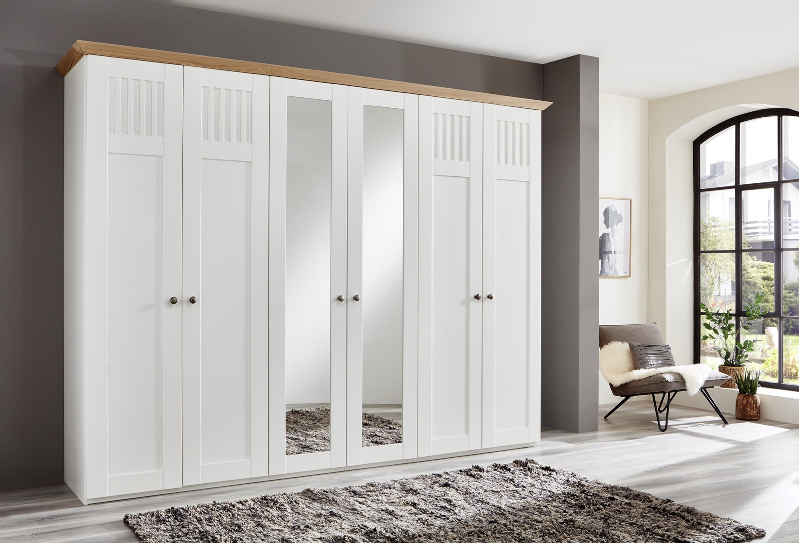 - Landhaus, Urlaub und mehr Meer gehen einem bei diesem Modell durch den Kopf. Weiße Echtlacktüren mit feinen Rahmen und massive Abdeckplatten aus harmonisch warmer Wildeiche auf den Kommoden runden dieses Wohlfühlschlafzimmer ab.